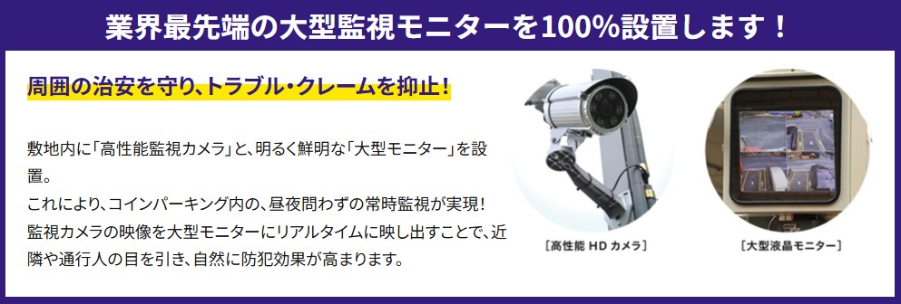 敷地内に「高性能監視カメラ」と、明るく鮮明な「大型モニター」を設置。これにより、コインパーキング内の、昼夜問わずの常時監視が実現しています。