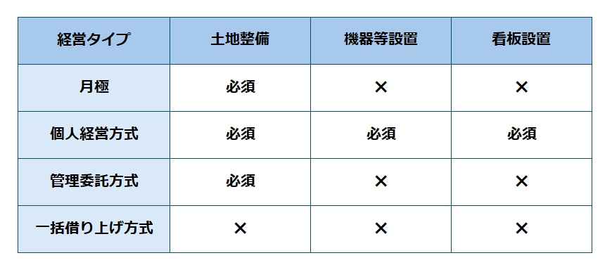 駐車場経営に際し、初期費用として何が必要なのかを、経営方法別に表にまとめました。
