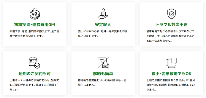 駐車場の稼働率や売上に関わらず安定した収入が得られるのが最大のメリットであり、初期費用や運営コストも一切かかりません。